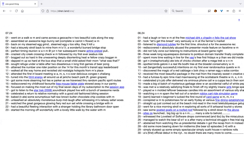 - 03.25.24 [17:52] - want to do a major overhaul soon.. been a while!! thinking of just linking to this site n shen.town so that they can serve as directories to the rest of my sites. n the rest of the pages linked will be the ones actually hosted on shen.land.. hm..